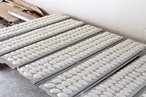かゆっこ餅は、うるち米ともち米を7対3の割合で混ぜて、固めに炊いたかゆを軽く練ってからしゃもじで形を作り取り分け、2、3日外気で凍らせます。